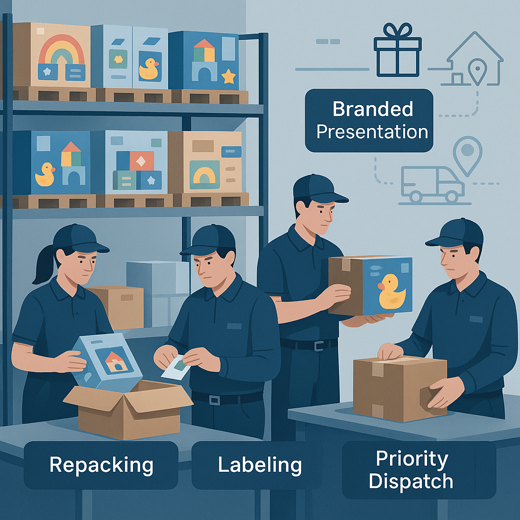 Including branding, over labelling, insertions, barcoding and product adjustments where necessary. Anything that is needed to get your product into the appropriate market